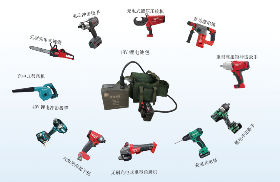本產(chǎn)品包括電池模塊、電動工具適配器、充電器、帆布背包,可為各種鋰電工具及設(shè)備提供電力,包括鋰電扳手、電錘、電鉆、角磨機、鏈鋸、噴漆槍等充電式工具,適配各個品牌工具。
