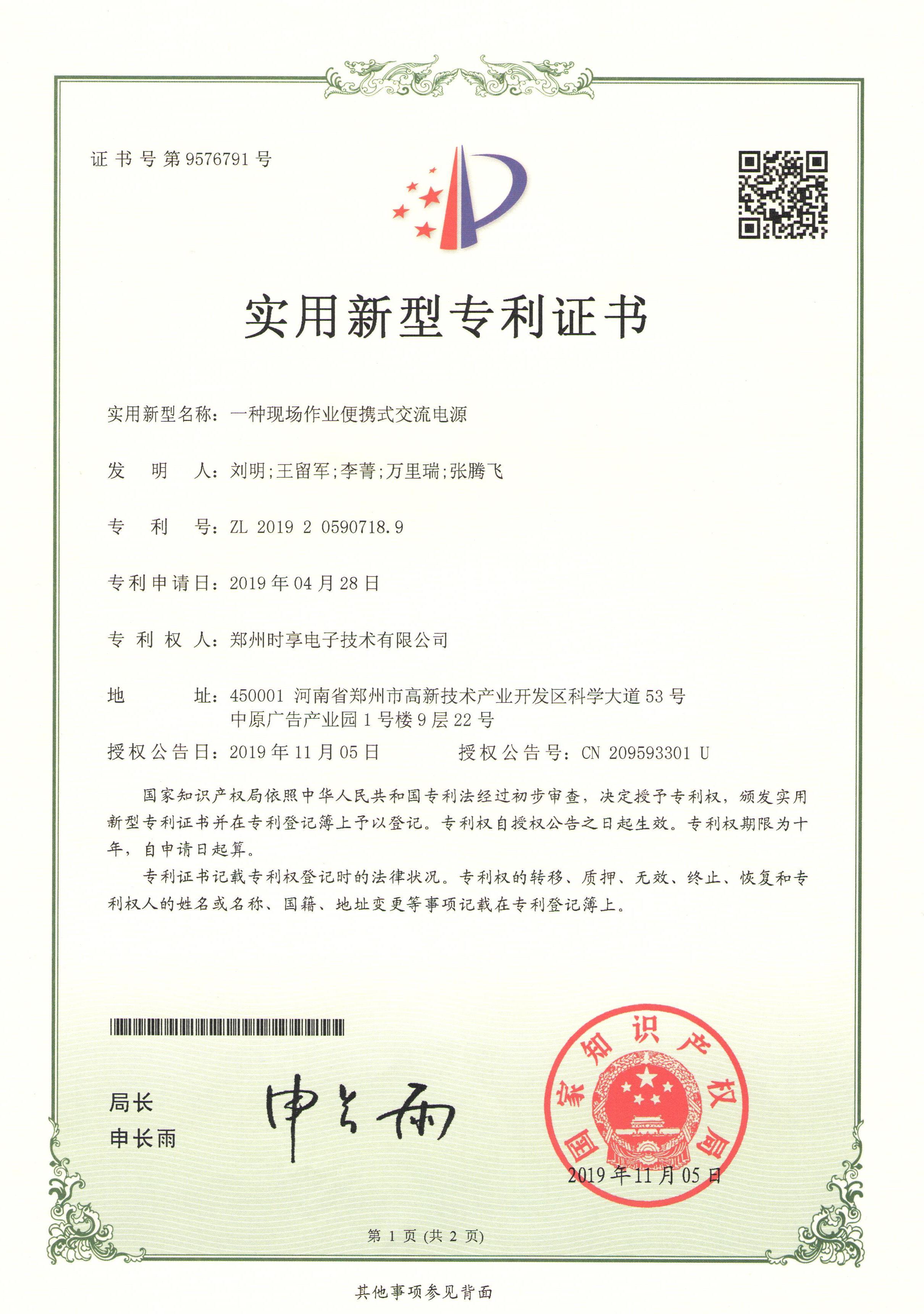 本產(chǎn)品獲得實(shí)用新型專利證書,證書號第9576791號。