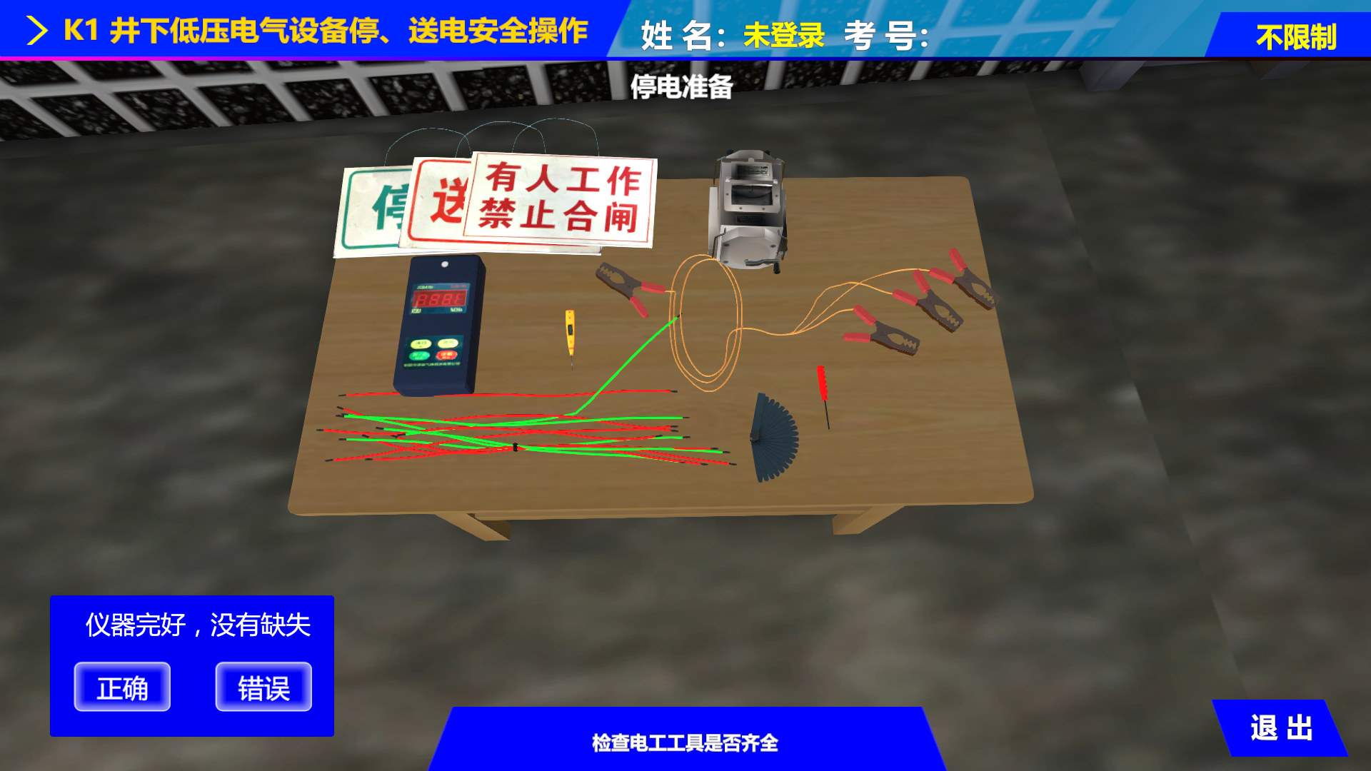 整體設(shè)計(jì)框架是由井下電氣作業(yè)硬件和軟件組成,有訓(xùn)練模式、考核模式兩種操作方式。